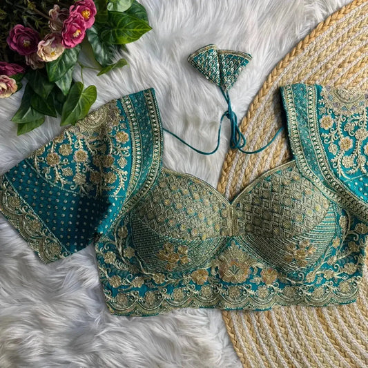 Design: Featuring a beautiful partywear design, this blouse boasts heavy stitching and padding for added comfort and support. The intricate latkans and back-open style enhance its charm, making it an elegant choice for parties, weddings, or any festive occasion.
