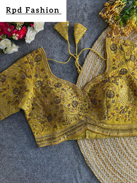 The height of the blouse is 15 inches or more, making it a versatile choice that can be paired with a variety of sarees or lehengas. Perfect for weddings, festivals, and special occasions, this golden handwork blouse is a timeless addition to your wardrobe.