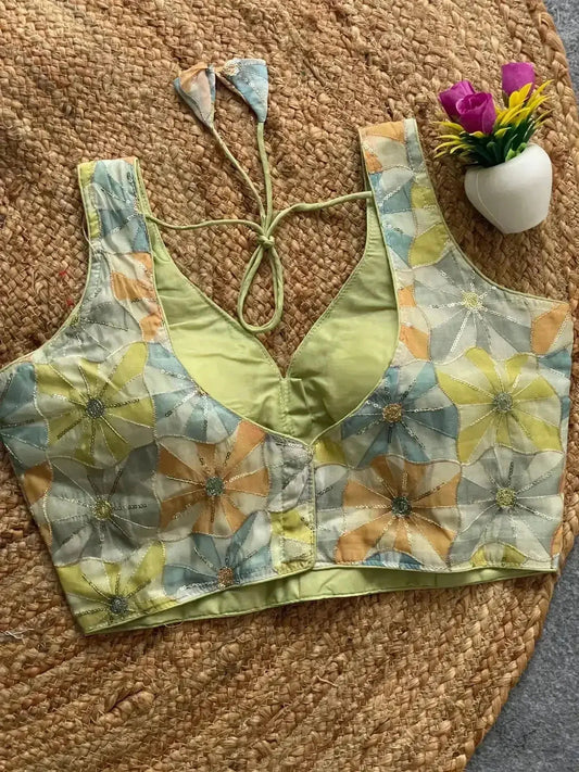 - Design: Beautifully crafted partywear blouse featuring intricate heavy stitching and padding for structure