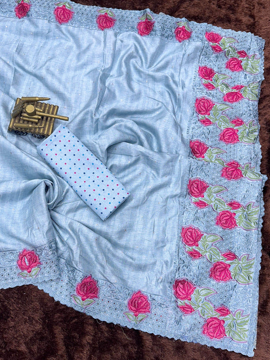 - Elegant Design: Featuring intricate embroidery work, this saree reflects artistry and sophistication, making it ideal for those who appreciate fine details.