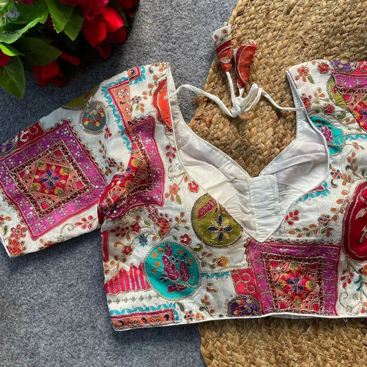 premium multicolour embroidered wedding blouse design, crafted to add elegance and charm to any festive or wedding look. Made with high-quality fabric and detailed with intricate patchwork, mirror work, and vibrant thread embroidery, this blouse stands out for its rich ethnic appeal.