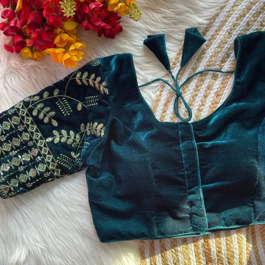 Enhance your ethnic wardrobe with this stunning Maroon Velvet Blouse, crafted from rich velvet fabric that offers a royal and elegant look. The blouse features intricate golden embroidery on the sleeves, adding a luxurious touch perfect for weddings, festive occasions, and special celebrations.