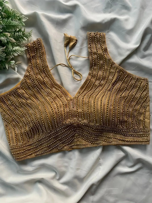 - Design: Beautifully crafted partywear blouse featuring intricate heavy stitching and padding for structure