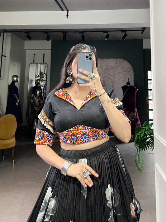Black Color Women's Tussar Silk With Print And Foil Print Lehenga choli Set