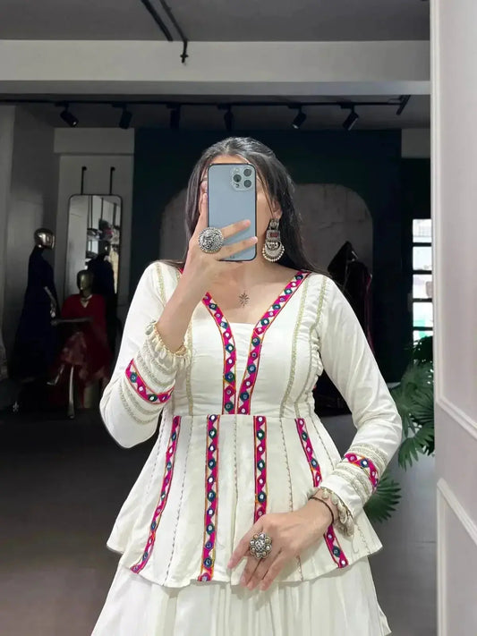 Regular price Rs. 2,500.00Regular priceUnit price / perRs. 4,000.00Sale price Rs. 2,500.00Get ready to dazzle this Navratri with our exquisite White Color Pure Rayon Embossed Navratri Lehenga Choli. Designed for elegance and comfort, this ensemble features a stunning embossed design with intricate mirror Gamthi work that will make your festive nights truly unforgettable. Crafted from high-quality pure rayon, this lehenga flows beautifully, offering both style and ease of movement.