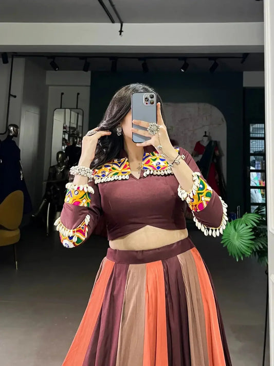 Brown Rayon Mirror Gamthi Lace Work Navratri Wear Lehenga Choli