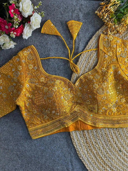 Constructed from premium heavy georgette, this blouse showcases a unique back open style, adding a contemporary twist to a timeless design. The heavy stitching enhances both durability and sophistication, making it a perfect choice for traditional or modern ensembles alike.