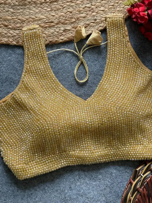 The sleeveless pattern with a classy V-neck front and tie-up back adds a modern yet traditional appeal. Ideal for weddings, receptions, festive occasions, and party wear, this pearl moti blouse ensures comfort, durability, and a flawless designer finish.