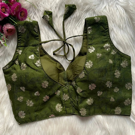 saree look with this stunning Jacquard silk blouse in rich olive green shade. Crafted with premium jacquard silk fabric and elegant floral woven motifs, this blouse offers a classy designer appeal. The deep V-neck front with shaping seams ensures a flattering fit, while the stylish back tie-up pattern adds charm and comfort. Perfect to pair with silk, cotton silk, Banarasi and festive sarees, this jacquard silk blouse is an ideal choice for weddings, parties and traditional occasions.