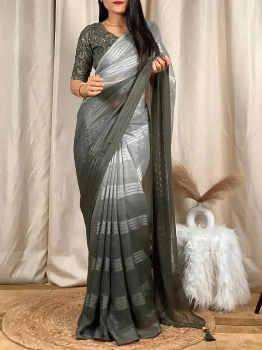 wardrobe with this beautiful georgette saree for women in an elegant grey-green shade. Crafted from soft, lightweight georgette fabric, this saree offers a graceful drape and all-day comfort. The subtle stripe pattern adds a modern touch, making it perfect for office wear, casual outings, festive gatherings and small functions. Pair it with statement jewellery and heels for a classy contemporary look.