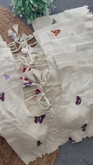 Made from soft, breathable khadi fabric, this ivory blouse features delicate **butterfly embroidery** on the sleeves and front, giving it a subtle yet elegant charm. The design includes **front potli buttons**, a stylish **square neckline**, and a **back dori tie** for a secure and adjustable fit. Perfect for pairing with cotton, linen, or handloom sarees, this blouse blends comfort with understated elegance.