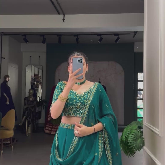 Elevate your wardrobe with our Green Plain Georgette A Line Lehenga Choli. This piece embodies elegance and comfort, making it a must-have for your festive collections. Whether you dress it up or down, you'll make a statement wherever you go.